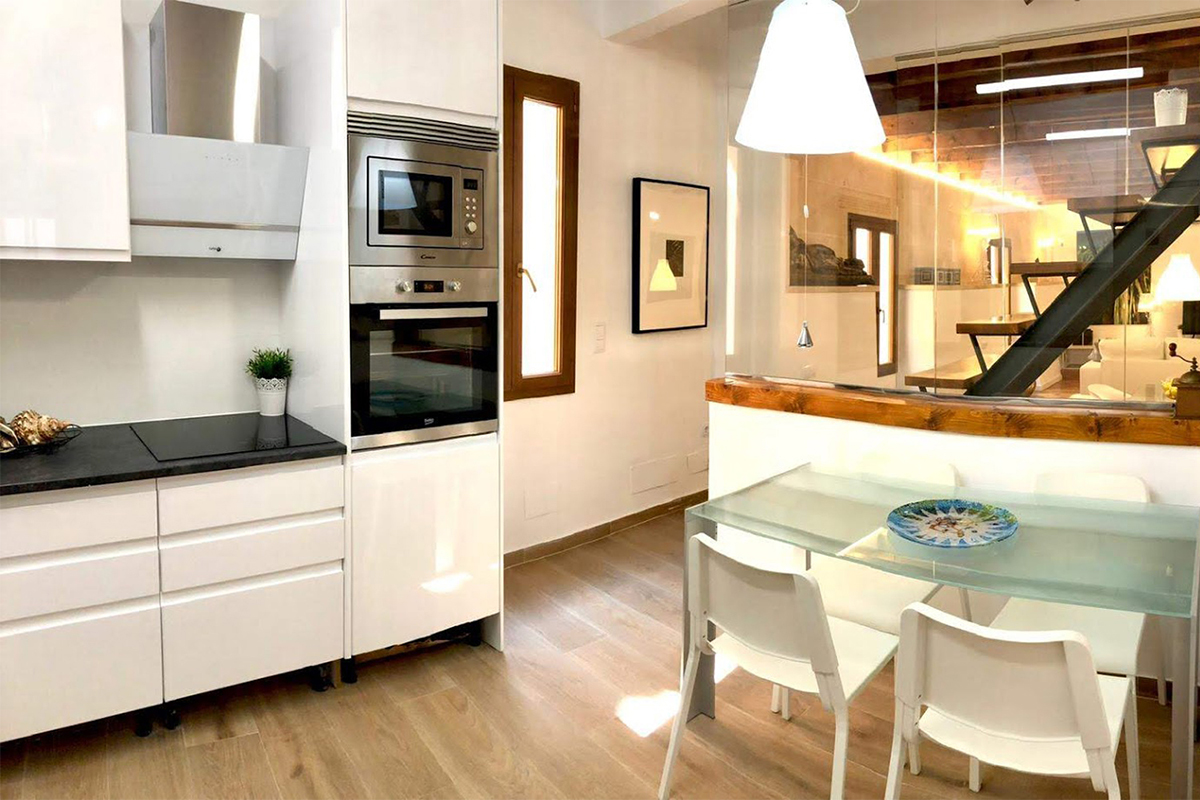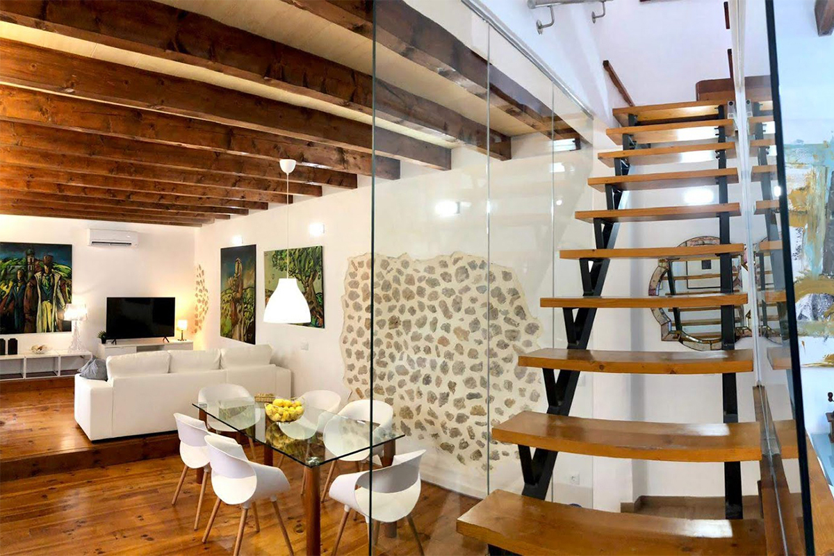 Wenn es um den Kauf einer Immobilie in Sóller geht, stehen zwei Dinge auf der Checkliste der meisten Leute: zum einen der traditionelle Charme und zum anderen die Aussicht auf die atemberaubende Talumgebung. Diese ideal umgebaute Maisonette-Wohnung hat definitiv beides. In einer ruhigen Gasse, nur wenige Schritte vom belebten Marktplatz der Stadt entfernt, befindet sich diese Wohnung mit zwei Schlafzimmern auf zwei Etagen in einem schönen alten Gebäude im Zentrum von Sóller. Die Innenräume wurden vollständig modernisiert, mit doppelt verglasten Fenstern, Glasverkleidungen und strahlend weißen Wänden, wobei jedoch durch Holzbalken und freigelegtes Originalmauerwerk der ursprüngliche Charakter erhalten blieb.