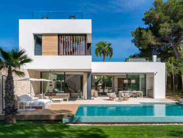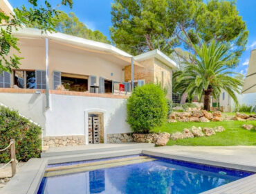 Einfamilienhaus mit fünf Schlafzimmern in Portals Nous mit Swimmingpool, Sonnenterrasse und üppiger Parkanlage sowie einer Gästewohnung mit großem Wohn-/Schlafraum und Bad.
