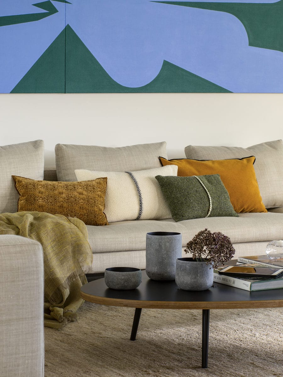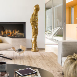 Die Verbindung zwischen den Innen- und Außenbereichen wird durch die clevere Verwendung von natürlichen Materialien und Ressourcen (wie z.B. Steinwänden und Holzschränken) noch gefestigt. Zarte, neutrale Erdtöne in Kombination mit Kunstwerken erzielt eine entspannte Atmosphäre.