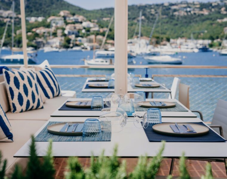 Entdecken Sie das ultimative kulinarische Erlebnis auf Mallorca mit den Restaurants Sumailla und Latitud39, mit Blick auf den Hafen und die Villen in den Bergen.