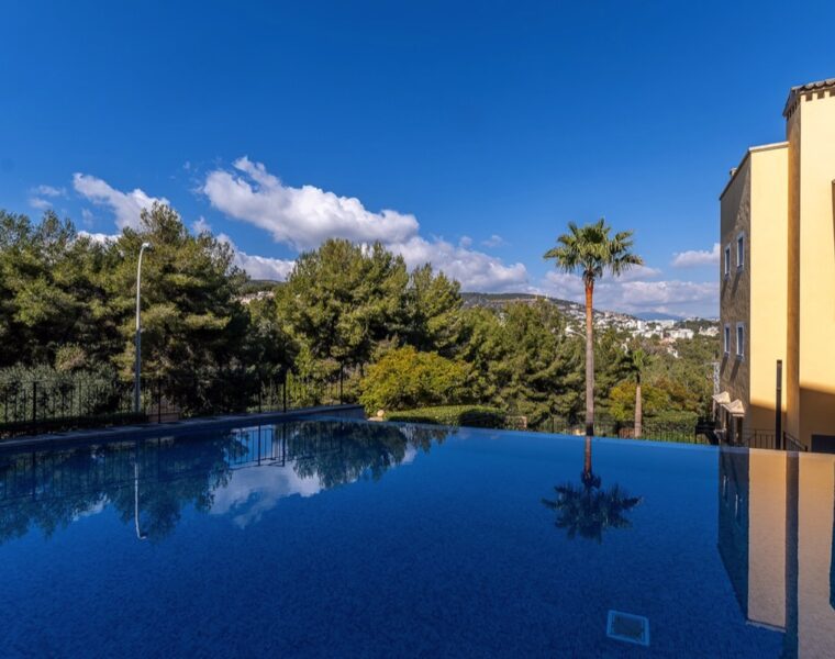 Moderne Wohnung mit herrlichem Blick auf das Meer und Bendinat in der exklusiven Enklave von Panorama. Das Anwesen verfügt über einen privaten Pool und einen privaten Parkplatz.