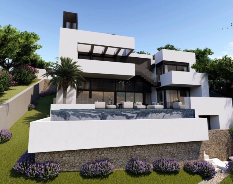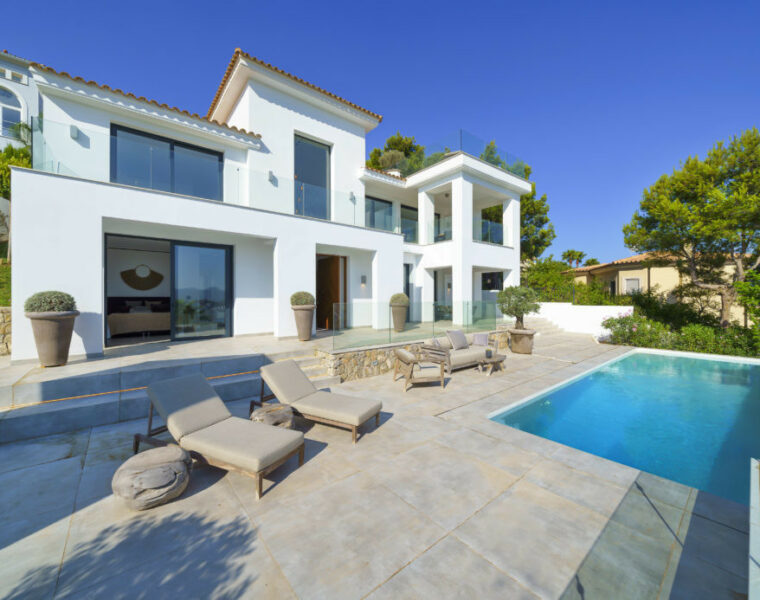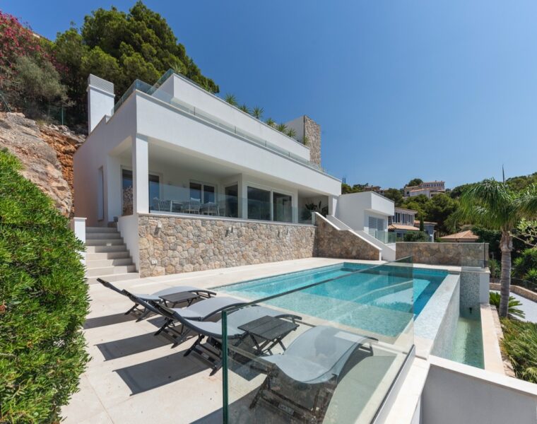 Moderne Luxusvilla in exklusiver Lage oberhalb von Port Adriano zu verkaufen, mit Pool und Dachterrasse mit beeindruckendem Meerblick.