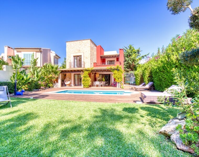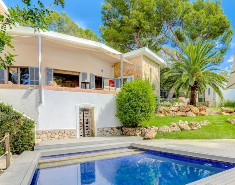 Diese zum Verkauf stehende Villa mit 4 Schlafzimmern in Santa Ponsa verfügt über einen schönen Garten, viel Charme und liegt in der Nähe von Port Adriano.