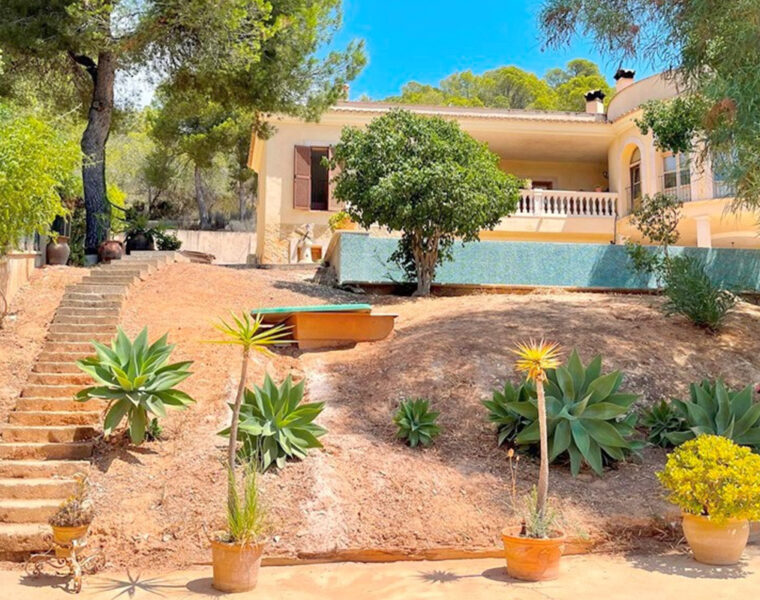 Diese Familienvilla in Paguera zum Verkauf verfügt über schöne hohe Decken, einen großen Pool und einen mediterranen Garten mit Obstbäumen.