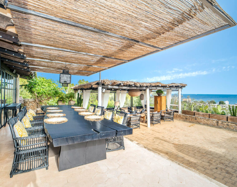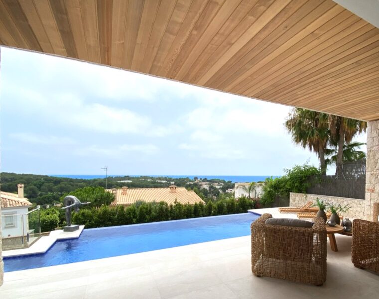 Wunderschöne 3-Schlafzimmer-Villa mit Meerblick zum Verkauf in Costa d’en Blanes, Gästeapartment und Pool mit Blick auf die Berge und das Meer inklusive