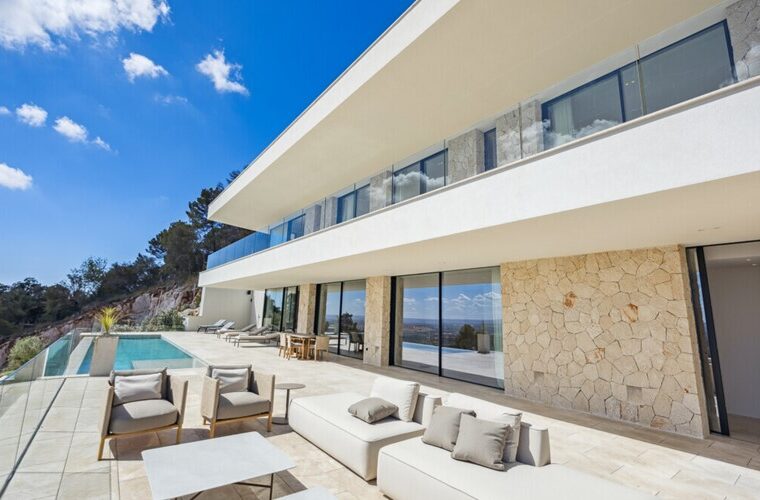 Zeitgenössische Villa in Costa d’en Blanes mit fünf Schlafzimmern en suite, Panoramameerblick, Pool, Garten und privater Dachterrasse mit Jacuzzi.