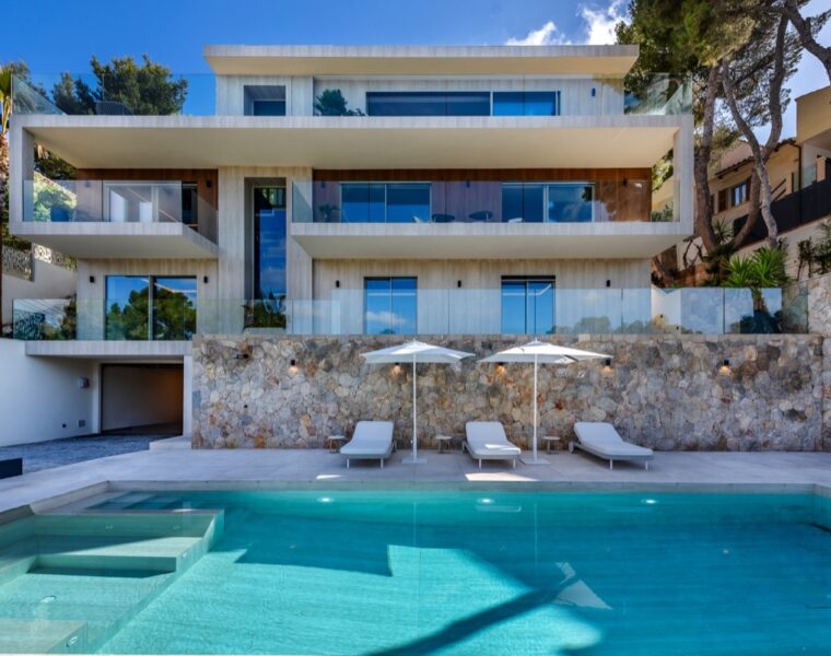 Eine nach Süden ausgerichtete Villa in Santa Ponça mit Meerblick, Solarstrom und einer nahtlosen Mischung aus elegantem Design, natürlichen Materialien und üppiger Landschaftsgestaltung.