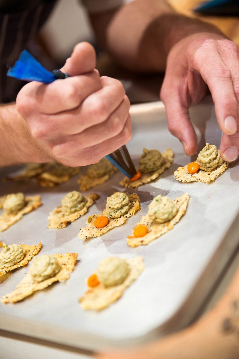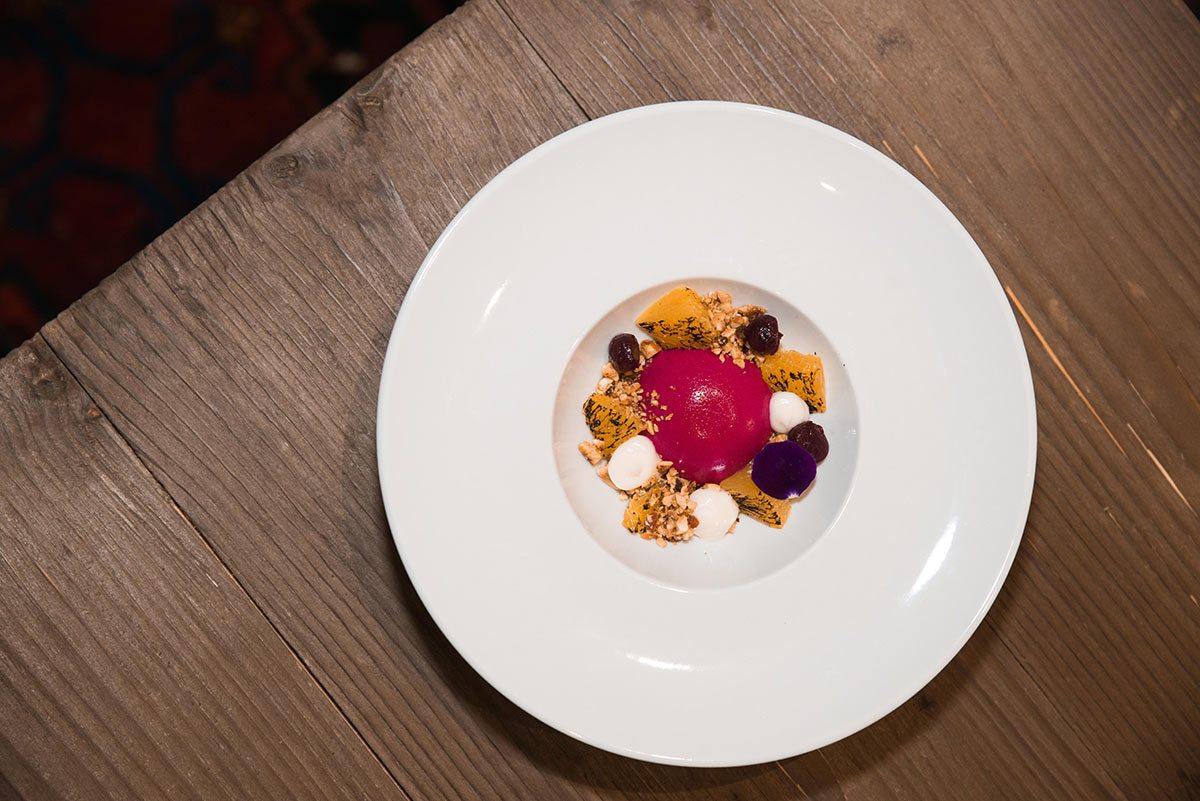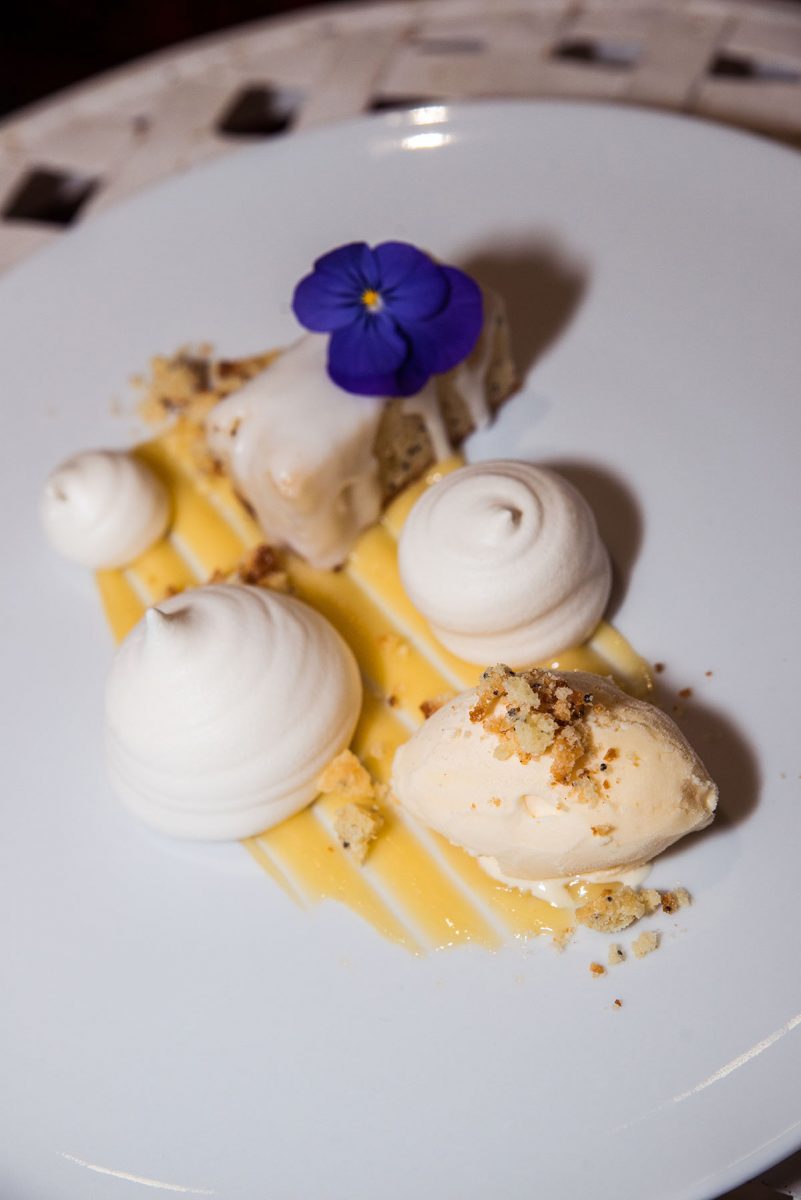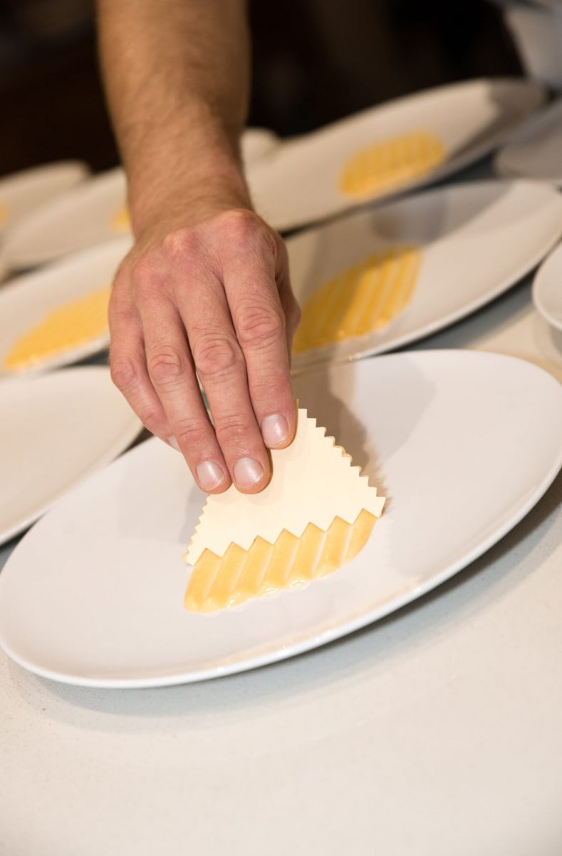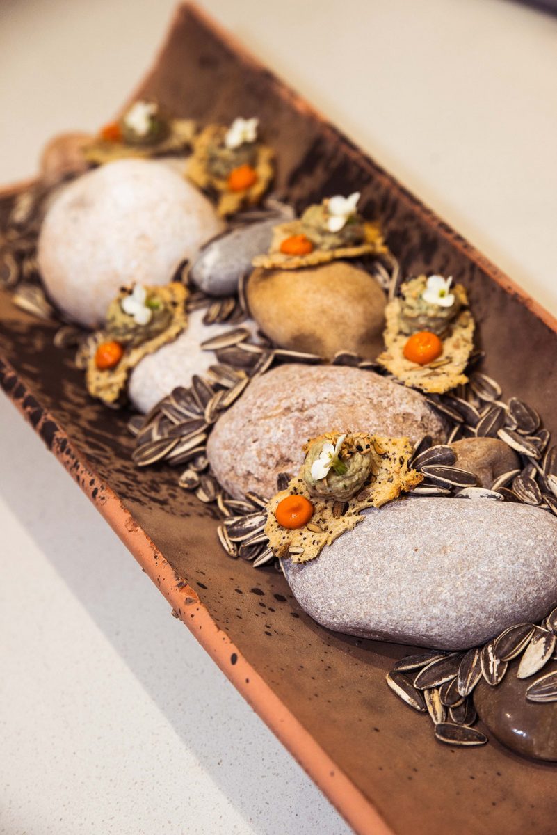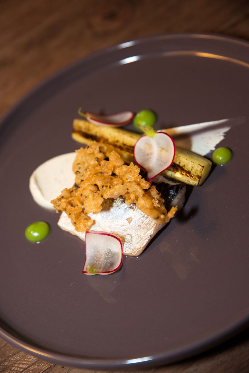 Die gedruckte Speisekarte verrät nur die Hauptzutat von jedem der acht Gerichte, welche Piers vor dem Servieren detailliert erklärt. Der Auftakt sind zwei beeindruckend angerichtete, aufeinanderfolgende Appetithäppchen: Auberginencreme auf einer kleinen Waffel (aus Piers eigenem Brot-Sauerteig) und dann ein Püree aus geräuchertem Lachs auf knuspriger Lachshaut mit Kapernstaub. In Australien studierte Piers Grafikdesign und seine natürlichen, künstlerischen und kreativen Talente spiegeln sich in jedem der köstlichen Gänge wider.