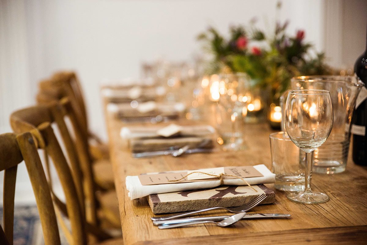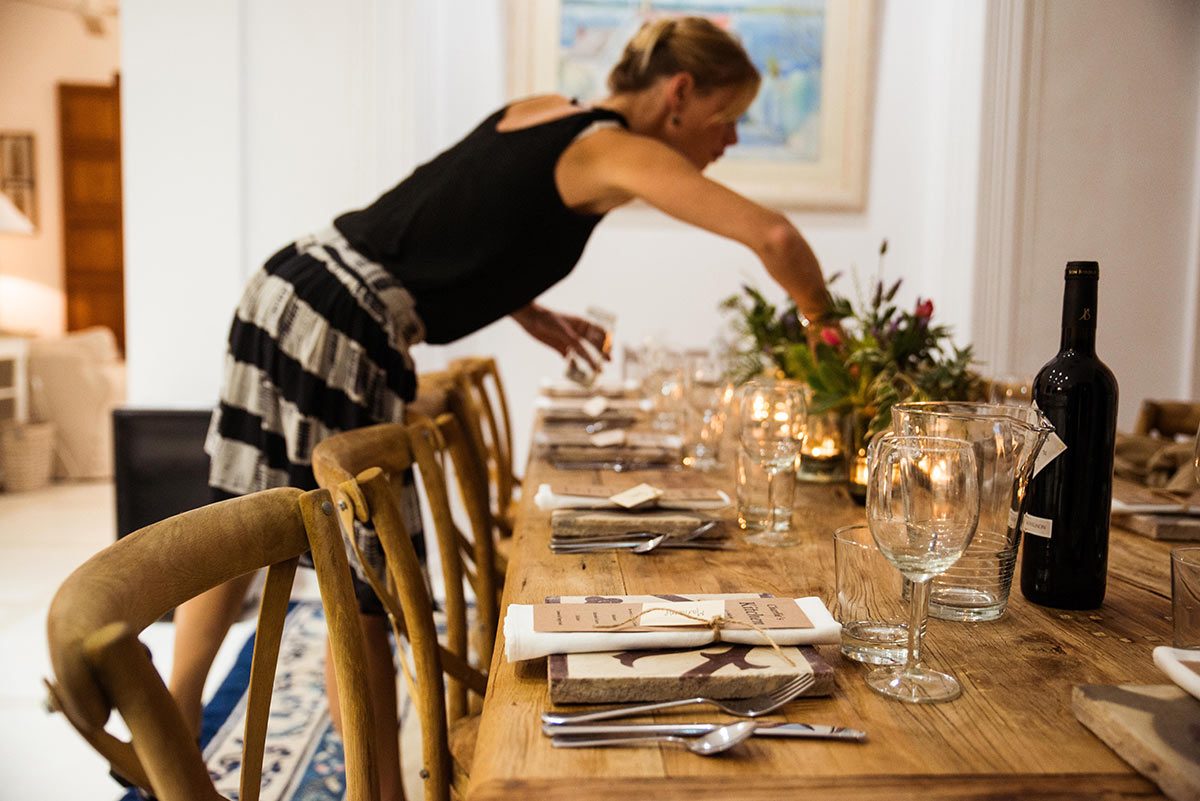 Im Ca’n Ballester waren wir zwölf Gäste, die sich bei einem Glas Cava kennenlernten, bevor wir unsere Plätze zugewiesen bekamen. Die einfache, jedoch elegante Tischdekoration, umfasste Teelichter und alte, mallorquinische Fliesen (aus dem Garten eines Freundes) als Tischsets.