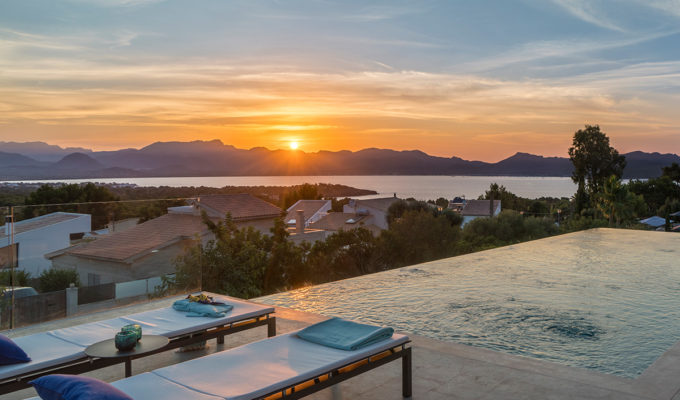 Jedes der vier Schlafzimmer verfügt über ein eigenes Bad. Das Herzstück des Hauses ist jedoch die offene Küche, ein Ess- und ein Wohnzimmer, in dem vom Boden bis zur Decke reichlich mallorquinisches Sonnenlicht durch die umlaufende Fensterfront fällt.