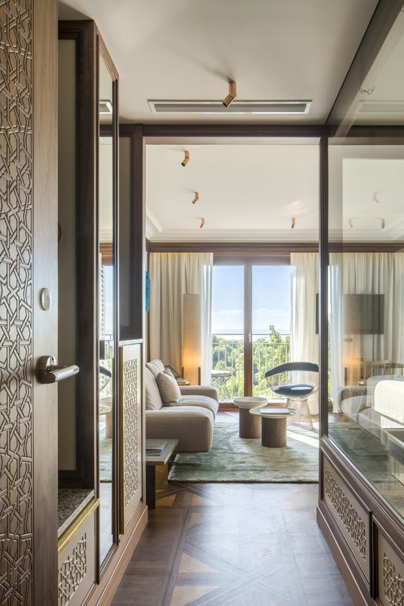 Das Design, das mit dem Extravaganten kokettiert, setzt sich in den Gästezimmern fort. Sie zeichnen sich durch eine fabelhafte Mischung aus Retro-Möbeln, prächtigen Parkettböden und natürlich reichlich maurischer Geometrie aus. Unsere Junior Suite im ersten Stock erstreckte sich bis zu einer begrünten Innenterrasse – war jedoch von anderen Räumen einsehbar. Die Technik in den Zimmern war auf höchstem Standard, mit einem Stimmungslichtsystem, einem Smart TV und einem iPad am Bett, das alles vom Kissenmenü bis zur Taxibuchung auf Knopfdruck bietet.