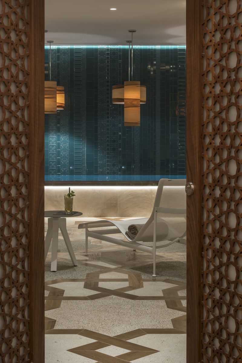 Die ereignisreiche Historie der Hauptstadt zeigt sich in den plüschigen Räumen des Hotels, wobei die Verehrung der maurischen Wurzeln im Mittelpunkt steht. Arabische Muster sind ein allgegenwärtiges Motiv – in Holztüren geschnitzt, in den Aufzügen bis hin zu den Handtüchern am Pool und der Schatten der Liegen auf der Dachterasse. Der Designer Magnus Ehrland hat diese überall präsente Geometrie mit einer Reihe anderer dekorativer Verzierungen verschmolzen, darunter goldschimmernde Beschläge, zahlreiche abstrakte Gemälde und Sonnenschirme im Tiki-Stil mit Rüschen. Das Ergebnis ist eine kunstvolle Mischung aus Palastatmosphäre und Verspieltheit.