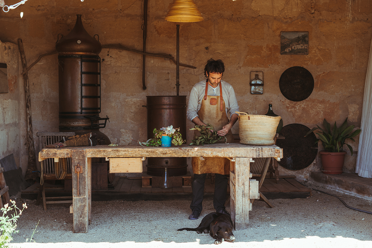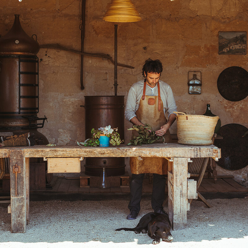 Wir treffen Juan Canaves in seinem Landhaus zwischen Sant Joan und Vilafranca de Bonany. Vogelgezwitscher und das Summen von Insekten folgen uns in einen schattigen Bereich des Hofs. Unser Gespräch dreht sich um das große Kupferteil, das noch an der weiß getünchten Wand steht. Der ehemalige Polizist betreibt sein Geschäft mit ätherischen Ölen seit 2016 hauptberuflich. „Mir fällt es schwer, es Geschäft zu nennen”, erzählt er, „denn es ist so viel mehr.”
