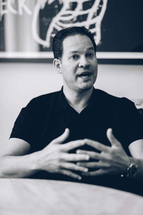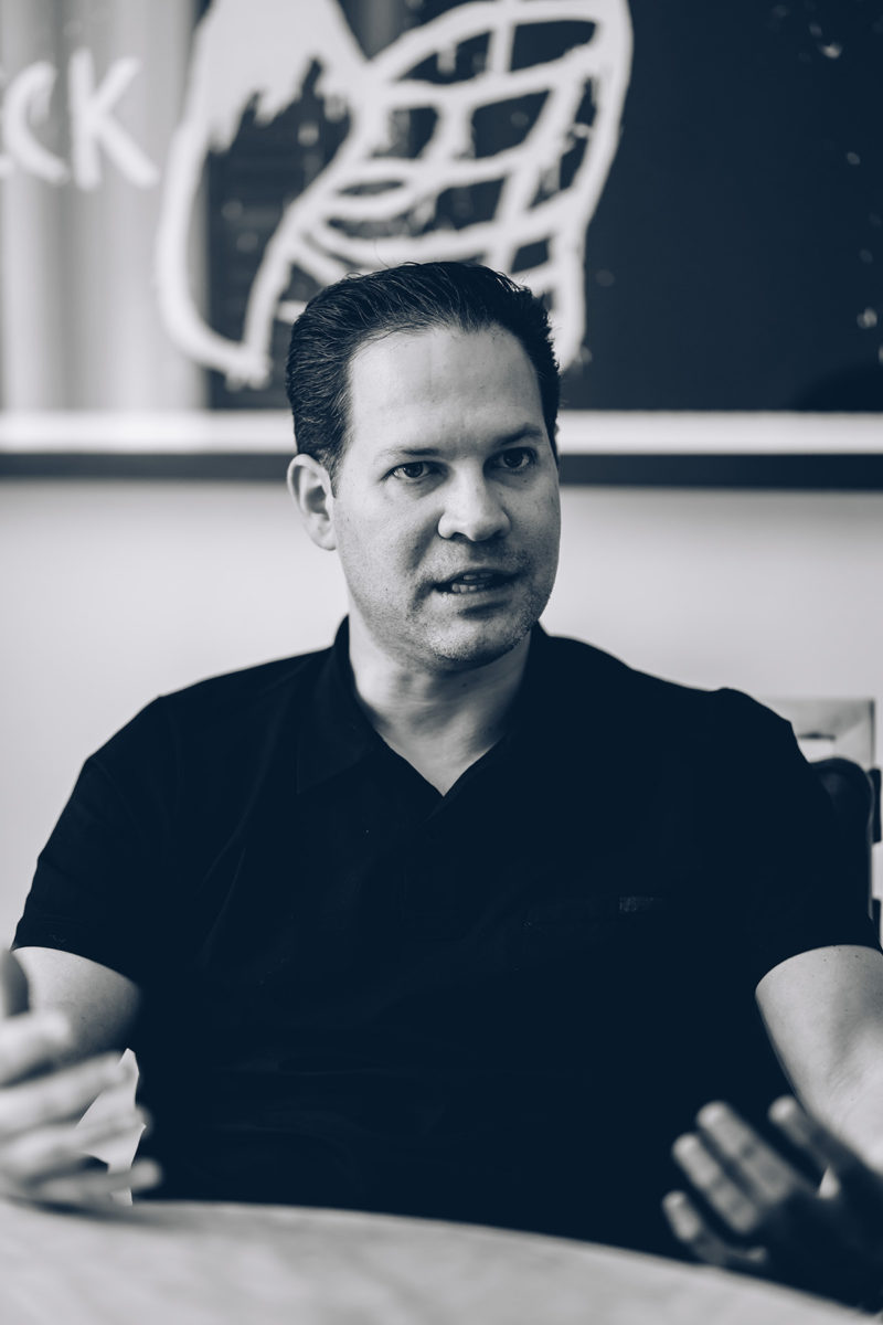Wir setzen uns und Drew ist so eloquent wie die Kunst, die ihn umgibt. Er ist dynamisch und leidenschaftlich, ein Charakterzug, den er seiner vorherigen Karriere in den USA zu verdanken hat. Wir fragen ihn, wie er die Werke für Gallery Red aussucht, und er antwortet mit einem Wort: „Instinkt.“ „Ich kann euch innerhalb von fünf Sekunden sagen, ob es sich um ein Werk handelt, das ich besitzen möchte“, sagt er, während er auf einige Werke um ihn herum deutet. Er nimmt sein Handy heraus und spricht über zehn neue Künstler mit denen er in Kontakt steht, und nicht per Telefon oder Email, sondern per WhatsApp. „Es ist ein Business, in dem man Beziehungen braucht… Ich bin immer auf der Suche nach einem neuen Werk, das mich fasziniert.“ Er macht eine Pause, bevor er weiterspricht. „Meine Philosophie, nach der ich Werke für meine Galerie aussuche, ist dieselbe mit der ich Werke für mich privat aussuche, ich kaufe nur solche, die ich mir auch in meinem Zuhause vorstellen kann.“