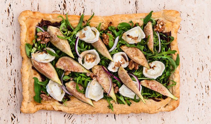 Zum Anrichten des Gerichts jeweils 2 Scheiben gebündelten Jamón auf einen Teller legen. Darauf 3 oder 4 Scheiben Pfirsich legen. Eine kleine Handvoll Rucola in die Mitte geben und einige abgerissene Minzblätter darüber streuen. Zum Schluss ein paar der kandierten Walnüsse, den zerbröckelten Fetakäse und einen Spritzer Balsamico-Essig darüber geben.