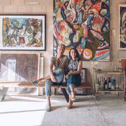 Der zweite Raum ist kleiner, intimer und abgetrennt, hier ist die Kreativität fast greifbar. Soeben vollendet und ausgestellt ist Grasons neuestes Werk – ein Auftrag des spanischen Models und Schauspielers Jon Kortajarena. Unter den Bildern fließt die getrocknete Farbe hinab und zeugt vom dynamischen und ungezügelten Schaffensprozess des Künstlers. Das Paar nutzt das Atelier auch für „Malpartys“, zu denen Gruppen von Freunden eingeladen werden, die dann zu klassischer Musik ihrer Kreativität freien, hemmungslosen Lauf lassen können.