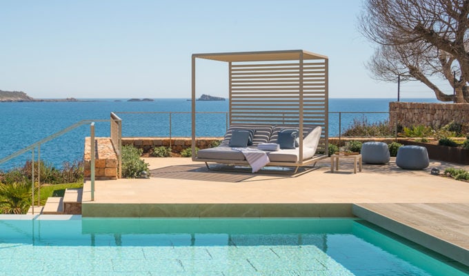 Natürliches Licht spielt ebenfalls eine wesentliche Rolle in der spektakulären Immobilie. Die Fliesen im Zenia-Stil, die für den Pool verwendet wurden, sind so entworfen, dass sie nicht die perfekte Reflexion des Himmels verzerren. Das Ergebnis ist ein beruhigendes türkisblau. Darüber hinaus vervollständigen die atemberaubenden Meerblicke diese paradiesische Komposition.