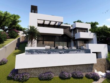 Diese Villa ist auf verschiedenen Ebenen gebaut und bietet ein Splitebenen-Gefühl mit hohen Decken und atemberaubenden Ausblicken. Das Anwesen verfügt über eine strahlend weiße Fassade und einen Infinity-Pool.