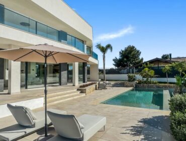 Diese moderne Villa in Cala Vinyes bietet eine atemberaubende Dachterrasse mit Panoramablick auf das Meer und die Berge sowie nahtlose Innen- und Außenbereiche.