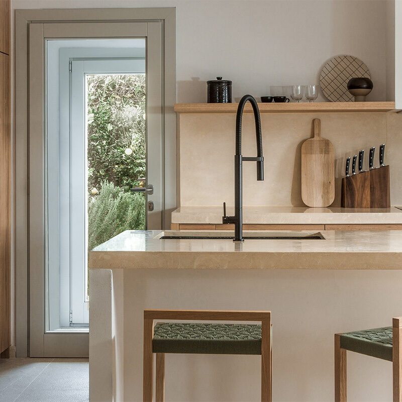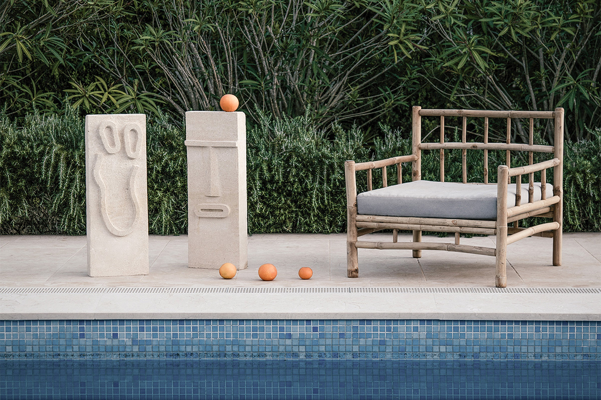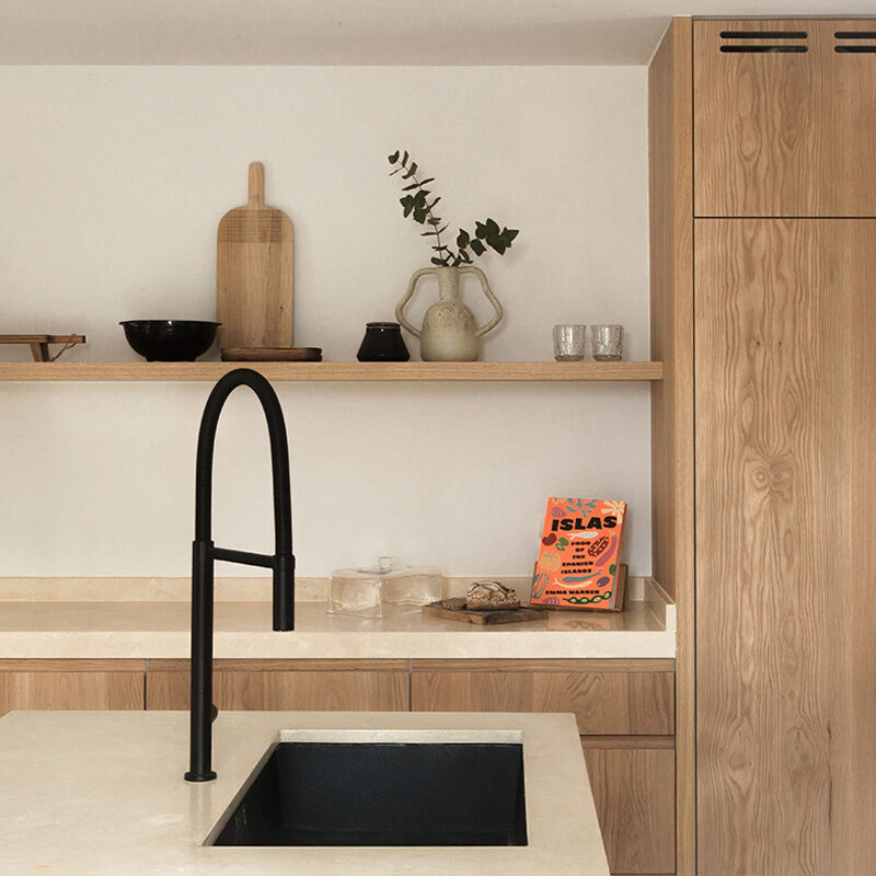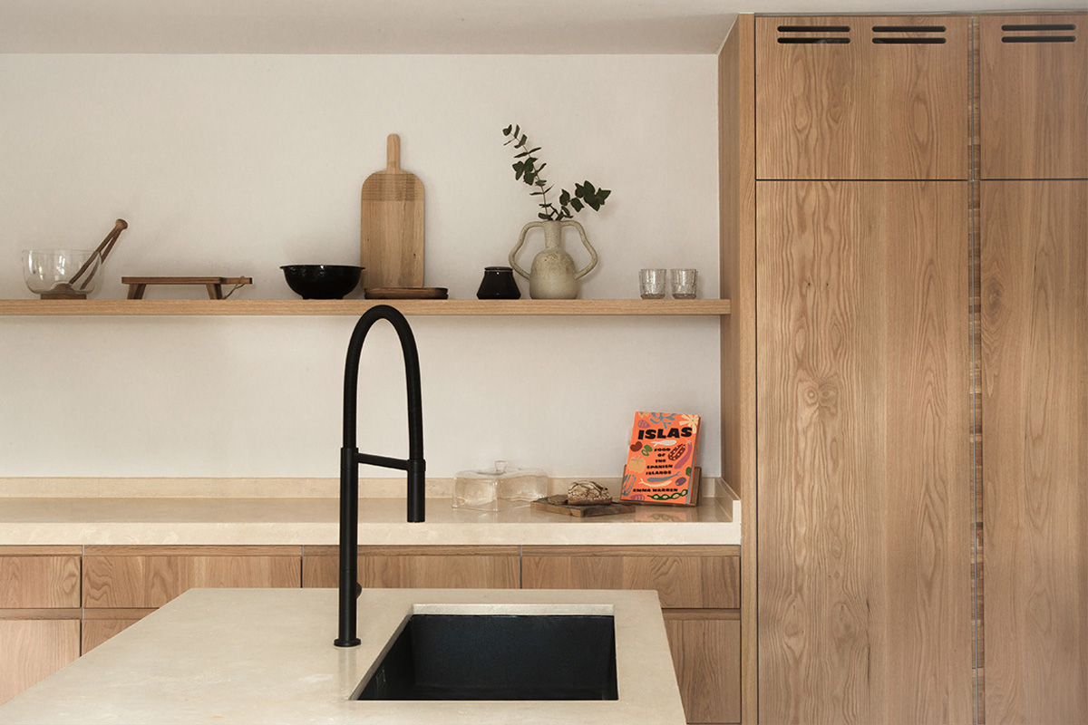 Für das Projekt wurden auch mallorquinische Designer und Künstler herangezogen, um sicherzustellen, dass auch die Inneneinrichtung einen Bezug zur Insel hat. Dunkle Betonwaschbecken mit Terrazzosplittern, Küchenschränke aus Naturholz und Arbeitsplatten aus Stein wurden von lokalen Handwerkern maßgefertigt, während ein Großteil der Möbel von Ateliers auf der Insel wie Contain und Jaia bezogen wurde.