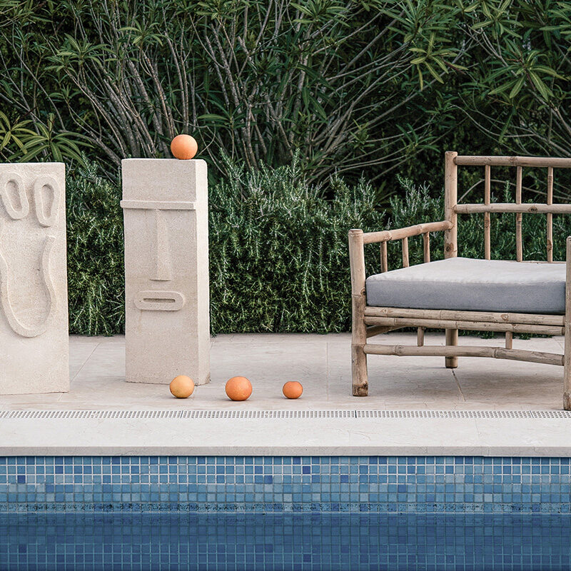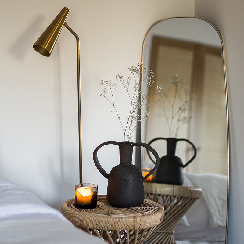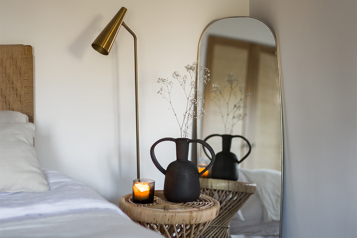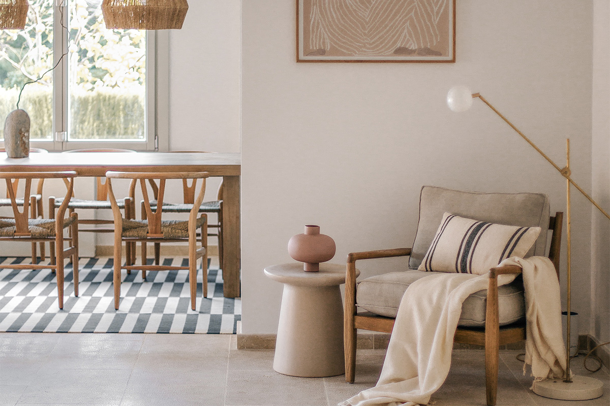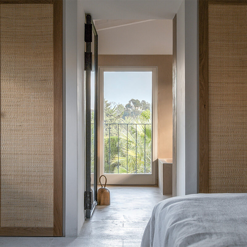 In Anlehnung an die natürliche Umgebung verwendeten sie Materialien wie Eiche, Rattan und Bambus, um dem Haus Charakter und Intimität zu verleihen: „Wir wollten einen Raum schaffen, der schon beim Betreten des Hauses einladend wirkt“, erklärt Anna. Die Wände wurden in blanco roto gestrichen, um den Innenräume Wärme zu verleihen, und die vorhandenen Steinfliesen wurden mit einer speziellen Abujardado-Schleiftechnik bearbeitet, um ihnen einen weicheren, rustikalen Charakter zu geben. Zu den moderneren Aspekten gehören die Mikrozementböden in allen Bädern, die einen kühlen Kontrapunkt zu den wärmeren, wohnlicheren Elementen bilden. Designer-Leuchten im gesamten Haus sorgen für einen Hauch von schickem, modernem Design, mit Leuchten von Top-Marken wie Cestita, Miguel Milá und Menu Space.