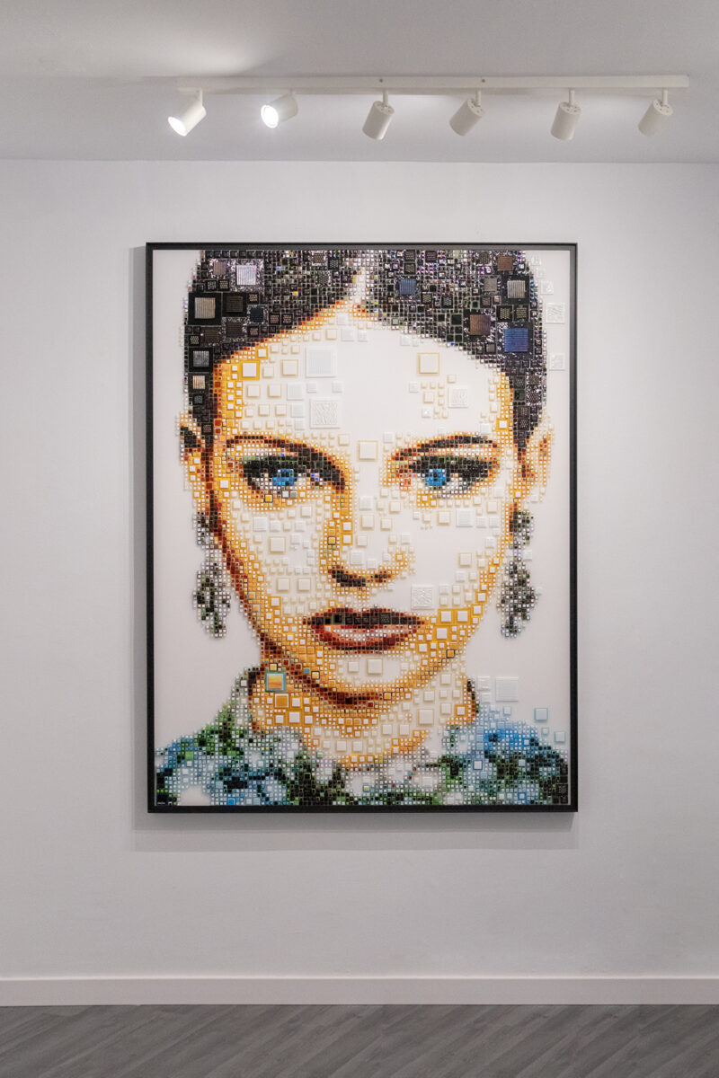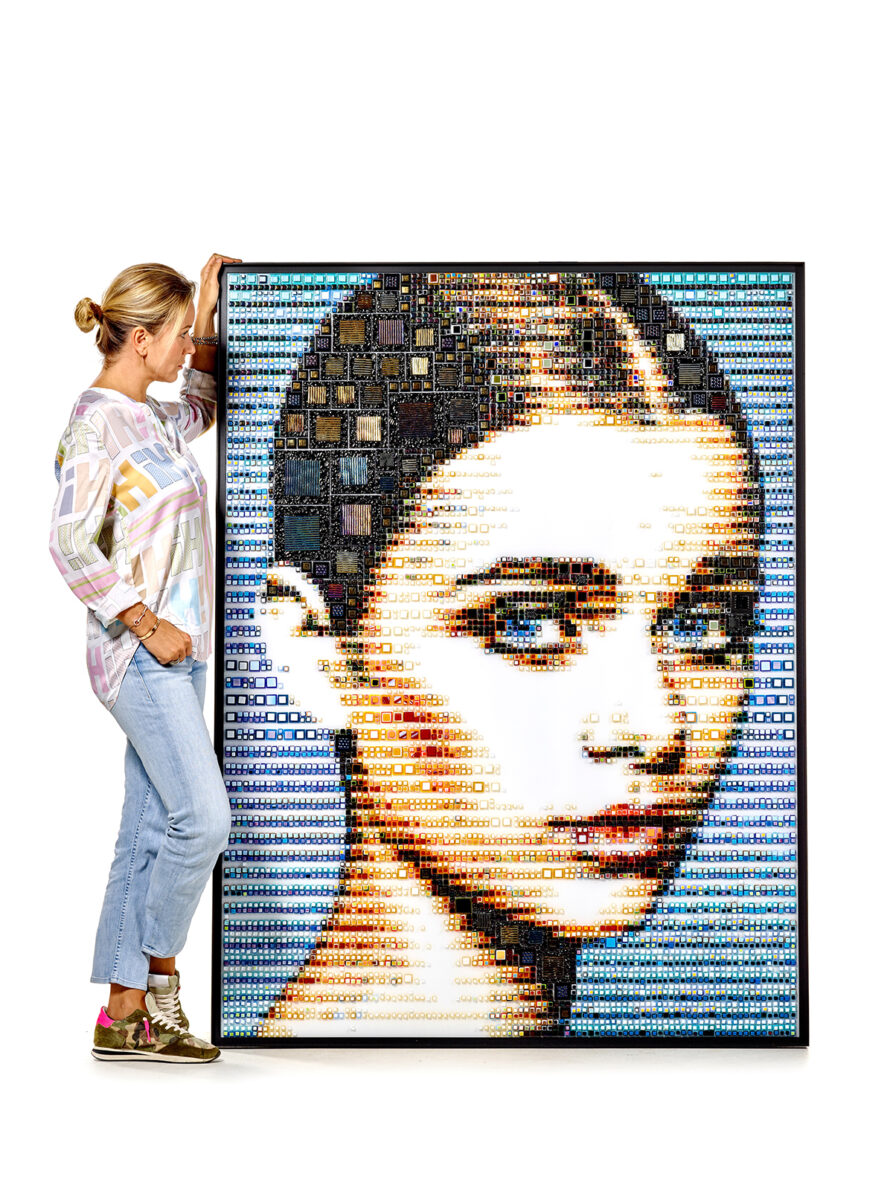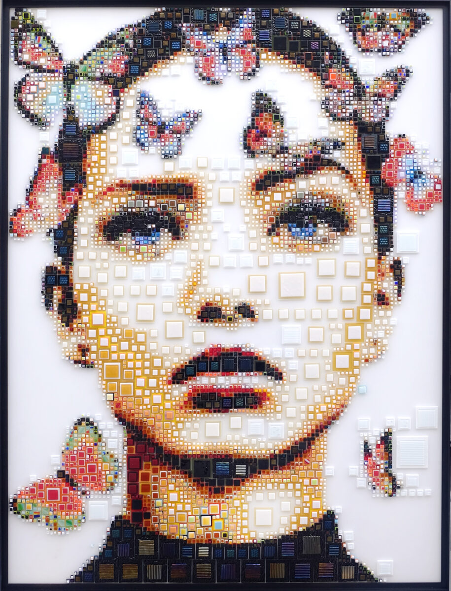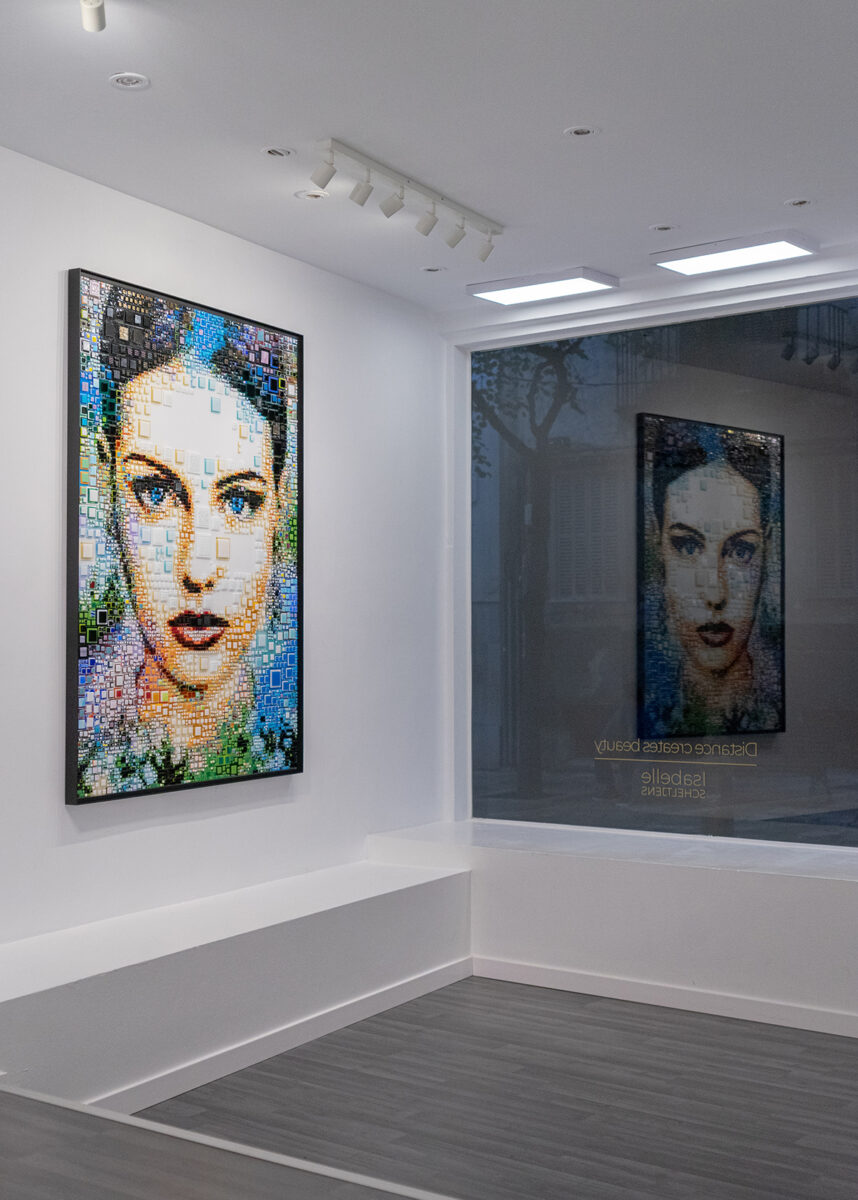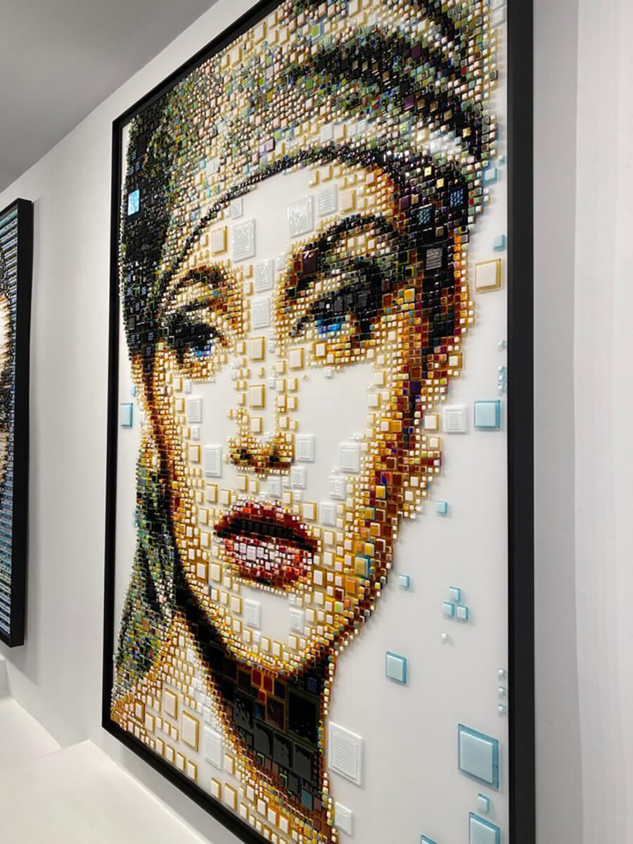 Die farbenfrohen Glasstücke sind wie die Farbpunkte der Pointillisten: aus der Nähe ein abstraktes Bild, aus der Ferne ein eindrucksvolles und präzises Porträt.