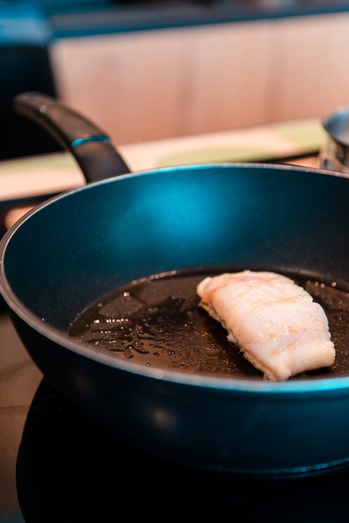 Get a pan really nice and hot and add a teaspoon of oil. Place the fish skin side down in the pan. Press down for a few seconds to ensure the skin cooks evenly. Cook on this side for approx 3 to 4 minutes. Lower the heat, and continue to cook for another approx. 3 minutes. Turn it over, cook for one minute and remove pan from the heat. The pan will still have enough heat to finish cooking the fish.
