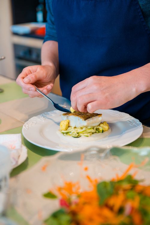 On the bottom of the plate, place a large spoon of the cauliflower puree. Next add the courgette spirals and carefully place the fish on top. Arrange the pickled cauliflower on top. Finish with a small squeeze of lemon juice.