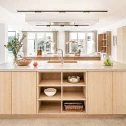 Unter der Leitung des Bauträgers Perlentaucher hat Espacio Home Design mit der Umsetzung einer Küche von Cocinart und dem Einsatz von mediterranen Materialien alle Wünsche erfüllt. Durchgehend wurden Schränke aus Natureiche eingebaut, darunter zwei große Kochinseln in der Mitte der Küche. Induktionsplatten, Ofen und Mikrowelle stammen alle von der Luxusmarke Gaggenau.