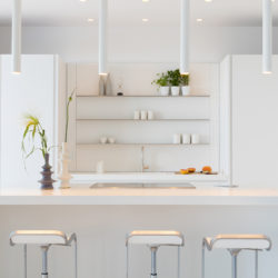 Der Küchenbereich führt in zwei Kinoräume, einen im Innenbereich und einen Außen. Beide sind mit Sofas in Naturtönen ausgestattet und die Designer haben es sich zur Aufgabe gemacht, dem Surround-Sound-Kinoerlebnis Eleganz zu verleihen. Im Kino des Hauses werden Frontlautsprecher der Bowers & Wilkins CT Cinema Series zusammen mit zwei Subwoofern eingesetzt. Das Außenkino wird mit einem High-Brightness-Projektor betrieben, der geschickt versteckt wurde, um jegliche Verkabelung oder unnötige Störungen im Design zu vermeiden.