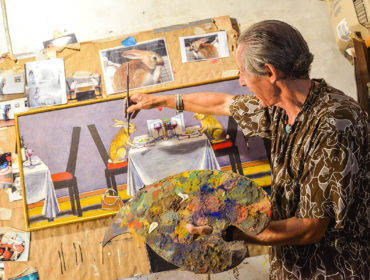 Fragt man jemanden, der in Deià lebt, ob er einen guten Künstler kennt, fällt wahrscheinlich als erstes der Name Arturo Rhodes. Der 1944 in London geborene Arturo studierte an der Watford School of Art und reiste dann in den 60er Jahren durch die Welt. Eine glückliche Begegnung in Deià führte dazu, dass er ein Haus in dem Dorf mietete, und der Rest ist, wie er selbst sagt, Geschichte! Seine surrealen Gemälde sind geistreich, witzig und berühmt für ihre Geschichten. Zu den Sammlern seiner Werke gehören Sir Roger McGough, Lord Andrew Lloyd Webber, Sinéad O’Connor, Sir Richard Branson und John Cleese.
