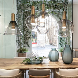 Der Showroom setzt die hochwertigen Möbel und Designobjekte hervorragend in Szene: Weiße Wände, Marmorboden und viel Grün kombiniert mit den historischen Elementen eines Stadthauses, wie ein beeindruckender Rundbogen aus Stein und sichtbare Deckenbalken sorgen für die mediterrane Note. Bunte Kunstwerke von Toni Pedraza verleihen dem Raum Leben, der sonst eher mit zurückhaltenden Farben versehen ist. Wie nicht anders von Espacio Home Design zu erwarten, ist der neue Showroom eine Meisterleistung. Hier bekommt man einen Eindruck davon, wie man hochwertige Marken so stilvoll präsentiert, dass sie nicht nur inspirieren, sondern beflügeln.