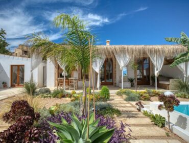 Luxury finca near Es Trenc beach with panoramic sea views, private pool, and landscaped gardens, offering a unique blend of modern and traditional design.