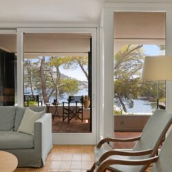 An einem der privilegiertesten Orte an der Südwestküste gelegen, verfügt diese Apartmentanlage direkt am Meer über eine Vielzahl von Vorzügen. Das vom Studio Arquitectura81 durchgeführte Renovierungsprojekt ist konsequent konservativ und respektiert die Anordnung des ursprünglichen Entwurfs des Gebäudes, das aus der Schule des renommierten Architekten Coderch Sentmenat stammt. Das Gebäude umfasst zwei Stockwerke, die geschickt an das abschüssige Gelände und den umgebenden Kiefernwald angepasst wurden. Aufgrund dieser Topographie erfolgt der Zugang über die oberen Stockwerke.