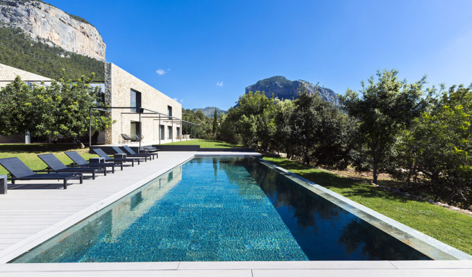 Die majestätischen Zwillingsgipfel des Alaró Berges bieten die Hintergrundkulisse für eine prächtige, kubistische Finca, die in landschaftlich gestalteten Gärten steht und über einen eleganten Poolbereich verfügt.