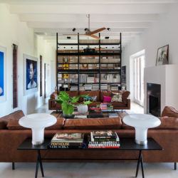 Im Inneren tritt der marokkanische Einfluss zurück und weicht einem minimalistischeren Stil, ein klares Weiß dominiert an Wänden und den hohen Balkendecken – ein optimaler Hintergrund für moderne Kunstwerke und Fotografien. Wie außen findet sich auch im Inneren die Symmetrie wieder, so im eleganten Lounge-Bereich, mit passenden Ledersofas und einem freistehenden Bücherregal, das für ein ausgewogenes, intimes Ambiente sorgt.