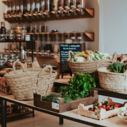 Auf der kleinen Terrasse kann man an zwei Tischen Kaffee und vegane Backwaren genießen. Im Inneren gibt es eine Fülle an Konsumgütern, angefangen von bunten Tischen mit frischem Obst und Gemüse (aus lokalem Anbau) bis zu Glasgefäßen und Spender mit Kräutern, Gewürzen, Nüssen, Samen, Körnern, Nudeln, getrocknetem Obst, Reis, Tee, Kaffee, Wein, Öl… Insgesamt stehen über 500 Produkte zur Verfügung, weitestgehend von lokalen Bio-Höfen, doch der helle, luftige Raum wirkt alles andere als überfüllt und lädt mit seiner ruhigen, freundlichen Atmosphäre zum Stöbern ein.