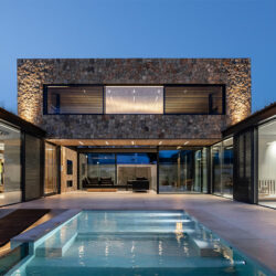 Der mallorquinische Stein ist die Hauptgrundlage des H60, der sich nahtlos in das Hauptgebäude, die Außenwand und die Plattformen einfügt. Glas ist das zweite, am häufigsten verwendete Material, das das Haus in drei isolierte Bereiche unterteilt. Kombiniert bildet es eine U-Form – eine wichtige Struktur in Joan und Olivers Vision des H60. In seinem rechteckigen Herzen befindet sich in der Mitte ein gläserner Pool, der von verschiedenen Seiten Einblicke in das Unterwasserschwimmen gewährt. Ein eleganter Blickpunkt, wenn man das Haus betritt. „Wenn die Elemente in Harmonie sind, weiß man, dass man in die richtige Richtung geht“, sagt Joan, die dafür gesorgt hat, dass das Grundstück auch genügend natürliches Laub hat. Von allen Dächern ragt ein dichtes Gras empor, das eine Anspielung auf die natürliche Landschaft der Insel ist. Joan und Oliver hoffen, dass andere Häuser diesem Beispiel folgen werden.
