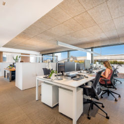Das Gebäude im Industriegebiet Son Bugadelles am Rande von Santa Ponça sieht genauso solide wie markant aus, zeigt aber auch eine einladende und spielerische Seite, die zum Besuch animiert. Im Parkhaus findet man bereits erste Anzeichen dafür, dass hier die Öko-Bilanz im Mittelpunkt steht: Man kann hier sein Elektroauto aufladen. Das Gebäude hat zwei Etagen und das Erdgeschoss hat die doppelte Deckenhöhe, um die Lagerfläche zu vergrößern. Von dort fährt ein Glasaufzug in das nächste Stockwerk, in dem sich die Arbeitsplätze befinden. Dort sorgen raumhohe Fenster für eine optimale Beleuchtung von Empfang, den Besprechungsräumen sowie von den technischen und administrativen Bereichen. Wände und Decken sind mit sisalartigen Geweben überzogen und isolieren gegen Temperatur und Schall, wodurch innen eine gute Akustik erreicht wird.