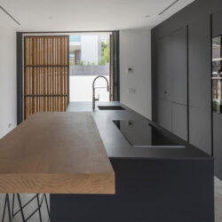 Mit ihren klaren Linien, der makellosen Verarbeitung und dem eleganten, zeitgenössischen Design steht dieses äußerst umweltfreundliche Haus in Colònia de Sant Pere ganz im Zeichen makelloser Oberflächen. Glattes Holz spielt eine zentrale Rolle, zusammen mit polierten Betonböden und beweglichen Verkleidungen, die dazu dienen, diskrete Räume zu schaffen oder sich zu öffnen, um Innen- und Außenwohnbereiche fließend ineinander übergehen zu lassen. Diàfan Arquitectura, das Architekturbüro, das hinter dem Entwurf des Hauses steht, betont, dass diese Kücheninsel als ein wichtiges „Möbelstück“ für sich selbst betrachtet werden sollte. Es handelt sich um eine elegante, rein schwarze Form mit einer Holzleiste darüber, die ihr die richtige Wärme verleiht und sie in das Haus als Ganzes integriert.