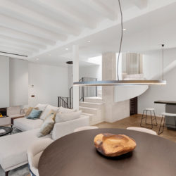 Architekt Miguel Arenas achtete darauf, viel von den ursprünglichen Bauelementen und der Bausubstanz zu erhalten. So bewahrte er die freigelegten Balken, den balearischen Stein und die Treppe – eine elegante Spiraltreppe, die vom Hauptwohnraum wegführt und ein zentrales Element des dreistöckigen Stadthauses darstellt.