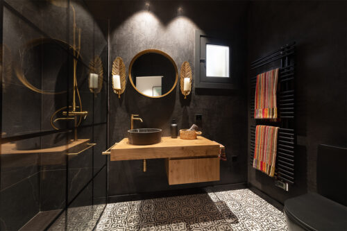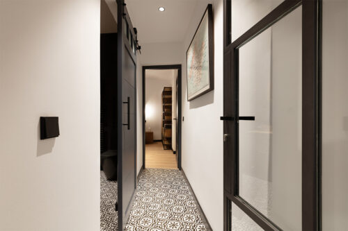 Hochwertige Möbel (wie der Sessel von Missoni) und Kunstwerke aus der Region verleihen dem Wohnbereich, der mit einem kleinen Innenhof verbunden ist, ein gemütliches und zugleich anspruchsvolles Aussehen. Es wurden Flügeltüren eingebaut, um viel Licht hereinzulassen, und die Fortsetzung der ausgefallenen Fliesen im Flur setzt sich draußen und in den Schlafzimmern und Bädern fort. Manch einer mag sich davor scheuen, Kohle- und Goldtöne in einen kleinen Innenraum einzubringen, aber Justine beweist, dass man mit dem richtigen Farbkontrast die Dunkelheit nutzen kann, um das Licht hervorzuheben.