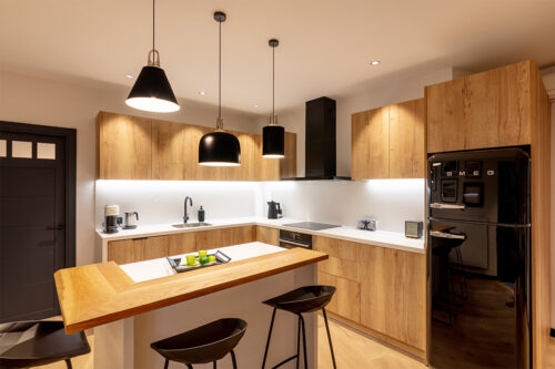 Die Wohnung ist zwar klein, doch Justine hat versucht, die ursprüngliche Struktur einschließlich der Natursteinwände zu berücksichtigen, indem sie eine Basis aus Sandstein mit Mustern und Farben kombiniert hat. Die Eigentümerin ist eine professionelle Visagistin, weshalb ihr wichtig war, der Inneneinrichtung einen Hauch von Spaß und Kreativität zu verleihen. Um diesen Effekt zu erzielen, wurde eine Schwarz-Weiß-Palette verwendet, die sich bei näherer Betrachtung als Eierschale und Kohle entpuppt. Eine abgeschwächte, viel leichtere Version der beiden Gegensätze. Der offene Wohn- und Küchenbereich vermittelt Wärme, mit Farbtupfern und Mustern. Die neue Küche besteht aus Eichenholz mit weißen Silestone-Oberflächen für die Arbeitsplatten, Spritzschutzwände und Einfassungen. Schwarze Geräte wie der Smeg-Kühlschrank passen zu den Barhockern und den Hängelampen über der Insel, die das sanfte Leuchten unter den Schränken und den Deckenspots ergänzen.