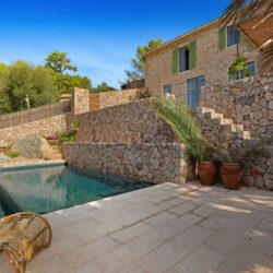 Bei der umfassenden Renovierung durch das in Portals Nous ansässige Büro Arquitectura 81 wurden traditionelle mallorquinische Materialien verwendet, um den rustikalen Charme dieses Hauses mit zwei Schlafzimmern zu erhalten. Im Außenbereich des Hauses in Esporles werden die Natursteinmauern durch helle, olivgrüne Fensterläden ergänzt, und auf der Rückseite führen Stufen von der Terrasse hinunter zum Pool ägyptischen Platten und einem sonnigen Chill-out-Bereich, mit gestockten. Von hier aus haben Sie einen atemberaubenden Blick auf die Sierra de Tramuntana. Die eleganten, minimalistischen und makellos verarbeiteten Innenräume vermitteln einen Hauch von ruhiger Raffinesse, mit Binissalem-Steinböden und weißen Wänden, gepaart mit der Wärme der Holzbalken im gesamten Gebäude. Der grob behauene Steinkamin im Wohnzimmer und die freiliegende Steinwand im Schlafzimmer verweisen auf die rustikalen Ursprünge des Anwesens und verleihen der klaren Schlichtheit der Wände und Böden Textur und zeitlosen Charakter.