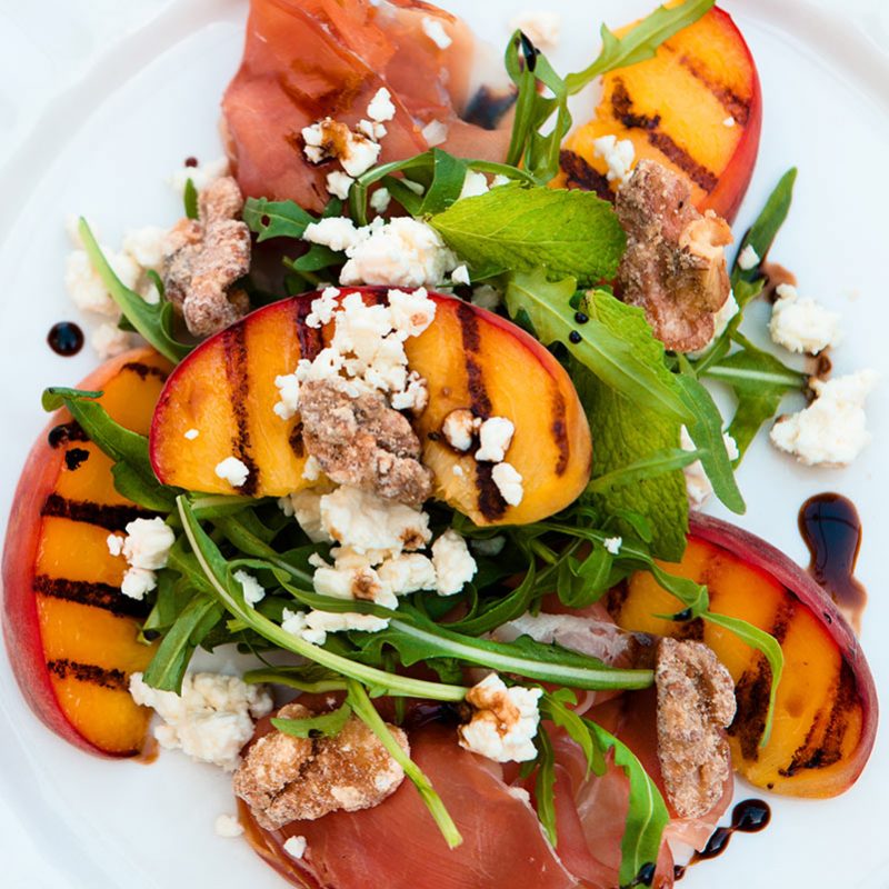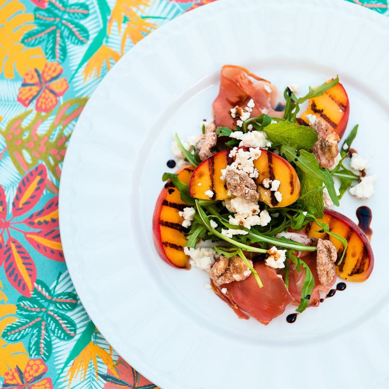 Manche finden es vielleicht etwas unorthodox, Obst auf den Grill zu legen, aber wenn man einen Pfirsich auf den Grill legt, wird sein natürlicher Zuckergehalt intensiviert und verleiht dieser farbenfrohen, köstlichen Vorspeise einen Hauch von Karamell.