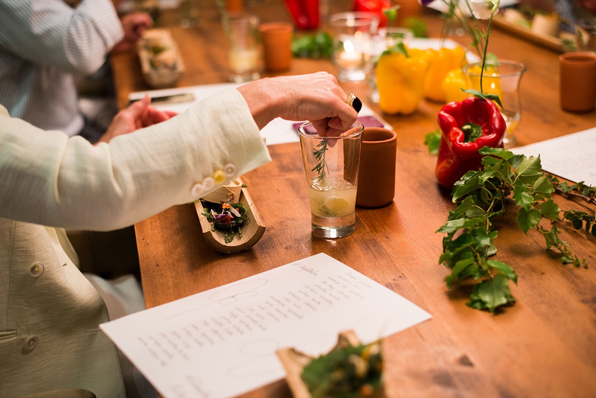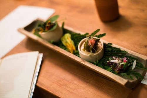 Wie auch in seinem eigenen Restaurant El Invernadero, hatte Rodrigo für jeden Gast ein Menü mit Bleistift aufgeschrieben und dabei die wichtigsten Zutaten jedes Gerichtes hervorgehoben: Gemüse, Obst und Kräuter – mit nur wenigen tierischen Produkten zum Garnieren. Rodrigo ist kein Vegetarier, aber seine Cuisine basiert vorwiegend auf pflanzlichen Produkten.