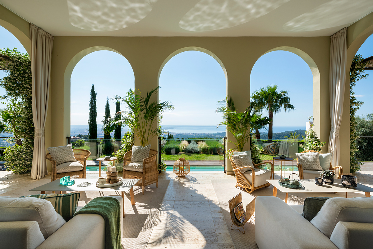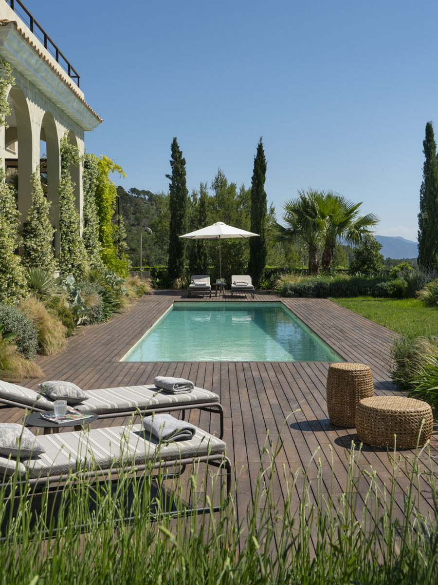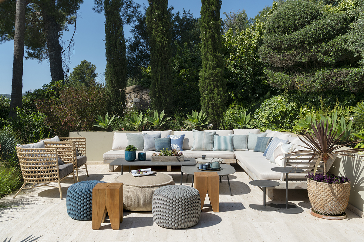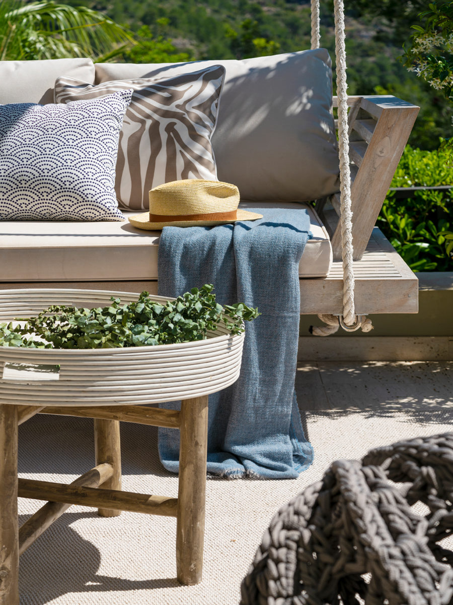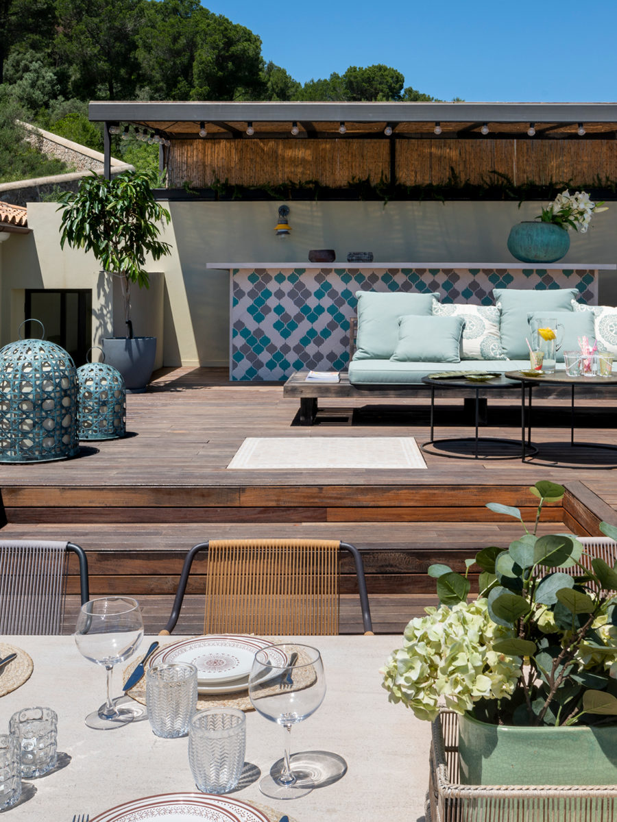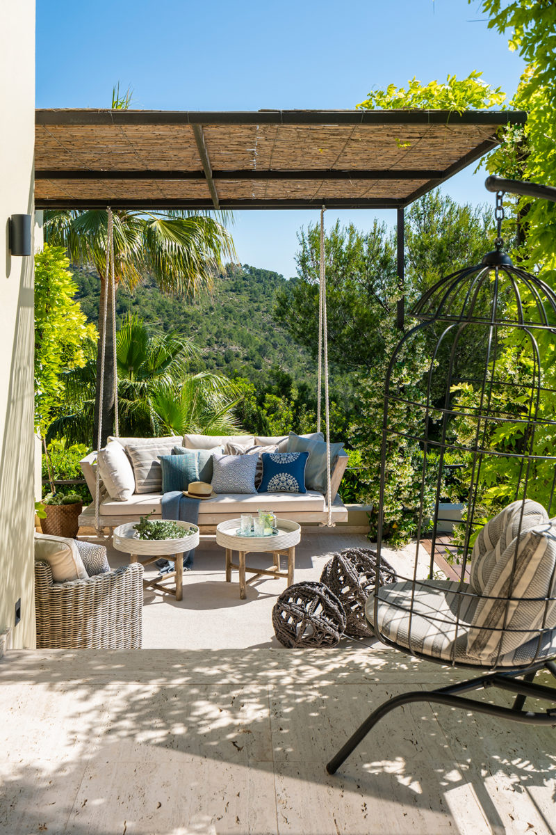 Die Entscheidung zur Renovierung fiel Helen bei einer Buchsignierung durch den preisgekrönten Stephen Woodhams. Anstatt sein Buch und ein paar Ideen zu präsentieren, wie sie es beabsichtigt hatte, verließ Helen die Signierstunde mit der Idee einer Zusammenarbeit. Kurze Zeit später flog Stephen nach Mallorca und traf Helen. Sie umrundeten gemeinsam den Garten, und wie Helen berichtet, hatte Stephen innerhalb von zwanzig Minuten “gesammelt, was er brauchte, um sein Designkonzept zu entwickeln”. Stephen war dafür bekannt, Pionier des ‘Innen-/Außen-Konzeptes’ zu sein, bei dem der Komfort von Innen nach Draußen gebracht wird. Au∫erdem hatte er die nötige Erfahrung, um Helen und Georgs Garten zum Leben zu erwecken. Er pflanzte fantastische Blumenbeete, führte einheimische, mediterrane Pflanzen ein und nivellierte die Grenzen neu. Er renoviert ebenso den Pool und schuf Platz für Geselligkeit, was Helen die Möglichkeit gab, Sonnenbänke von Roda, Puffs von Paola Linti und Gartenmöbel von Livingdreams einzubauen. “Es war die beste Investition, die wir je getätigt haben, um diesen erstaunlichen Garten zu schaffen”, sagt Georg, der jetzt mehr Zeit im Garten verbringt als je zuvor.
