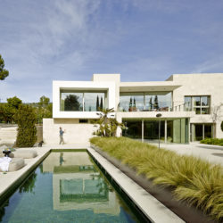 Der cremefarbene Kalkstein dominiert die lichtdurchfluteten Flure. Nur an manchen Stellen wird dieser von einer Wandverkleidung aus leicht kurvigen Eichenleisten abgelöst, die im Kontrast zu der ansonsten einheitlichen Verwendung rechter Winkel steht. Durchsichtige Glaswände verbinden die Innenräume, die auch einen schimmernden Mosaik-Pool umfassen, und sorgen für viel natürliches Licht und unterschiedliche Aussichtspunkte auf den umliegenden Garten.