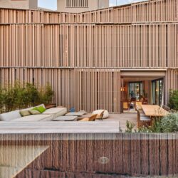 Eine elegante zweiteilige Fassade bildet die dynamische Hülle des Gebäudes mit 10 Wohneinheiten. Mehr als 350 vertikale Schiebeläden aus Holz sind eine moderne Anspielung auf die traditionellen mallorquinischen Fensterläden, welche die Sonne filtern und das Licht sowie den Schatten in den Wohnbereichen mit Blick auf den Paseo regulieren. „Sie sind sehr konfigurierbar, sehr durchlässig und sehr flexibel“, beschreibt Paloma. Eine zweite, massivere, strukturierte Steinfassade schützt die privateren Räume vor jeglichem Außenlärm und schafft so ein größeres Gefühl von Privatsphäre. In Verbindung mit einer Querlüftung und einem Wärmerückgewinnungssystem sorgt dies für maximale Energieeffizienz.