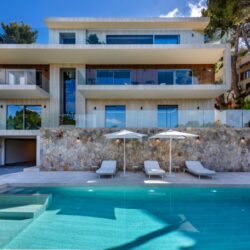 Das 559,80 Quadratmeter große Haus, das nun vollständig fertiggestellt ist, besticht vor allem durch den atemberaubenden Blick auf den Med, den man von jedem Zimmer aus hat, und durch die große Liebe zum Detail. Die Hauptfassade ist eine spektakuläre, warme und elegante Kombination aus Feinsteinzeug und Holz, die sowohl Langlebigkeit als auch einfache Pflege garantiert. Natursteinverkleidungen in den Bädern, Holz mit Fischgrätenmuster in den Schlafzimmern und das Spiel mit indirekter Beleuchtung und Phasenverschiebung in den Zwischendecken verleihen den Innenräumen eine gemütliche Wohnlichkeit.